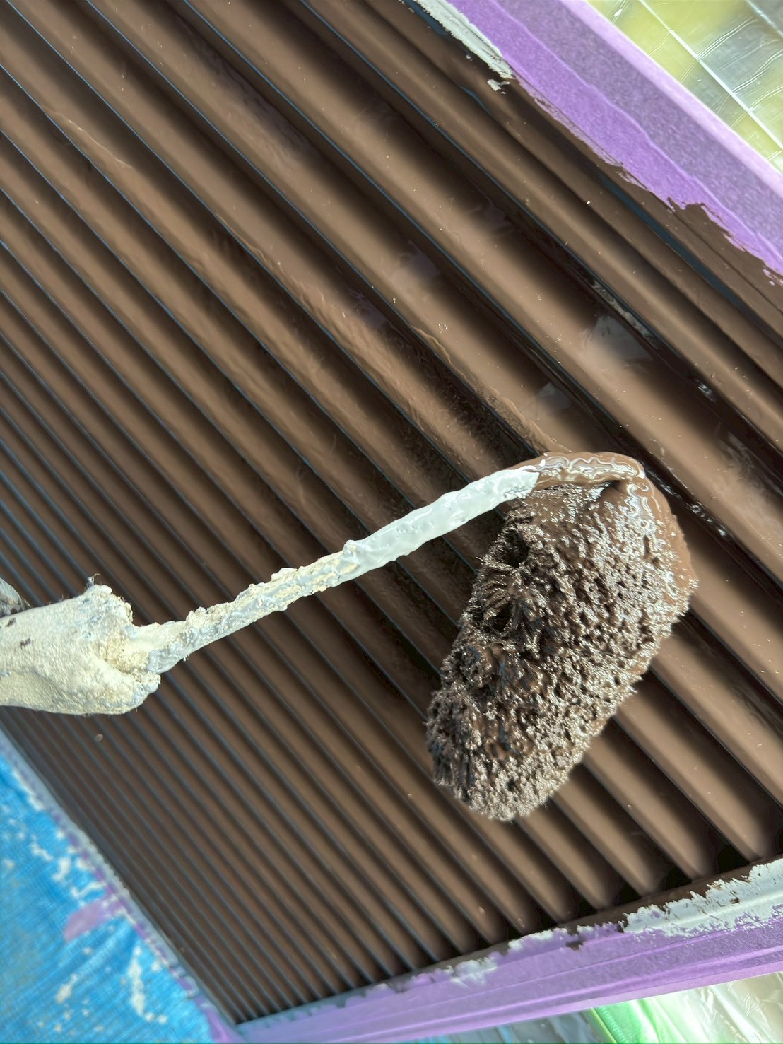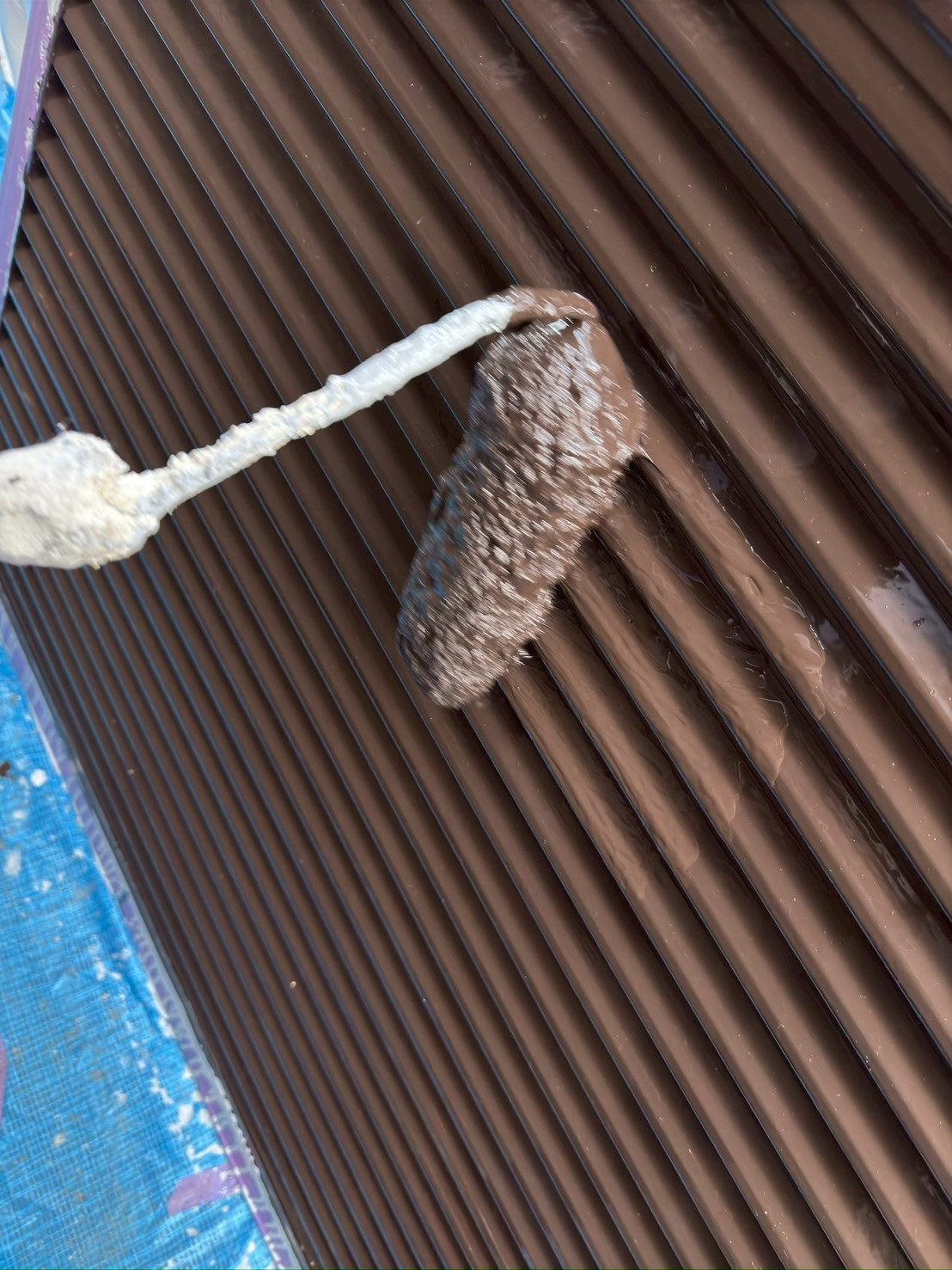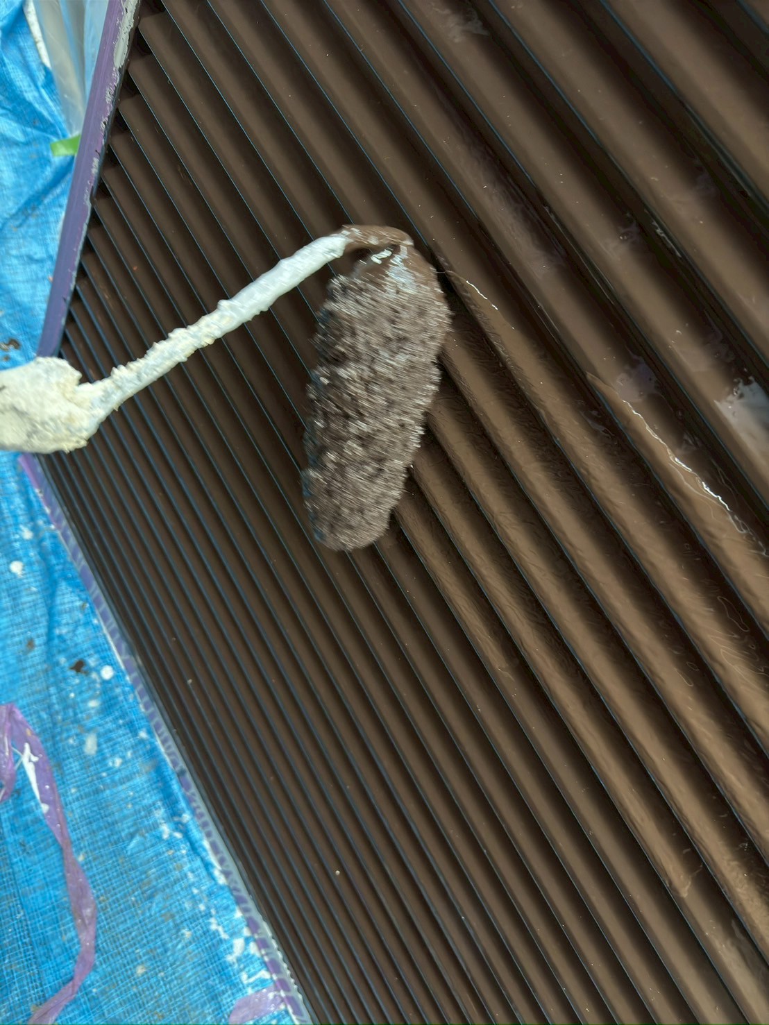 本塗装1回目として、こげ茶のシリコン塗料を使用しています。