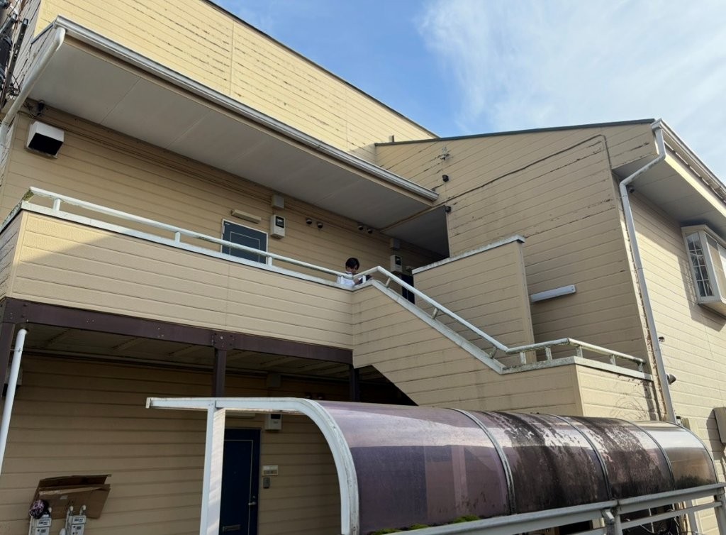 外壁・屋根ともに高圧洗浄を実施し、長年蓄積した汚れ・藻・旧塗膜の劣化粉を徹底的に除去します。塗料の密着性を高めるため、アパート全体をムラなく洗浄しました。