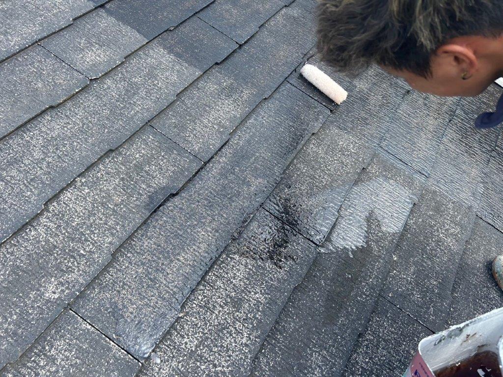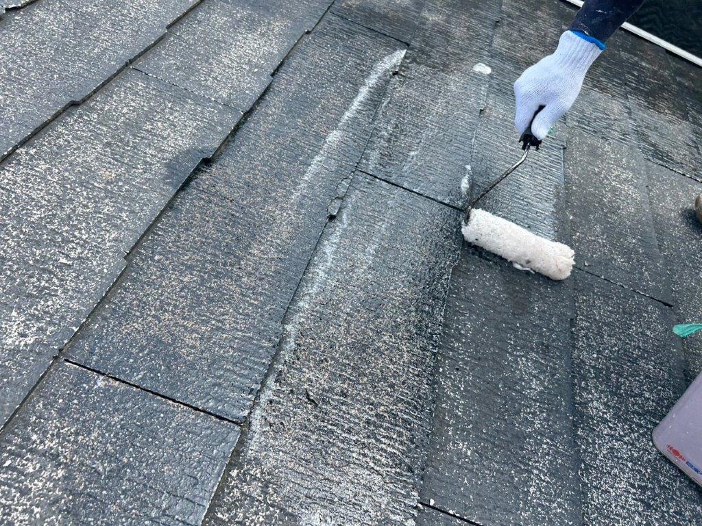 スレート屋根の下塗り塗装(シーラー塗布)|千葉市花見川区の戸建て住宅にて塗り替えリフォーム中