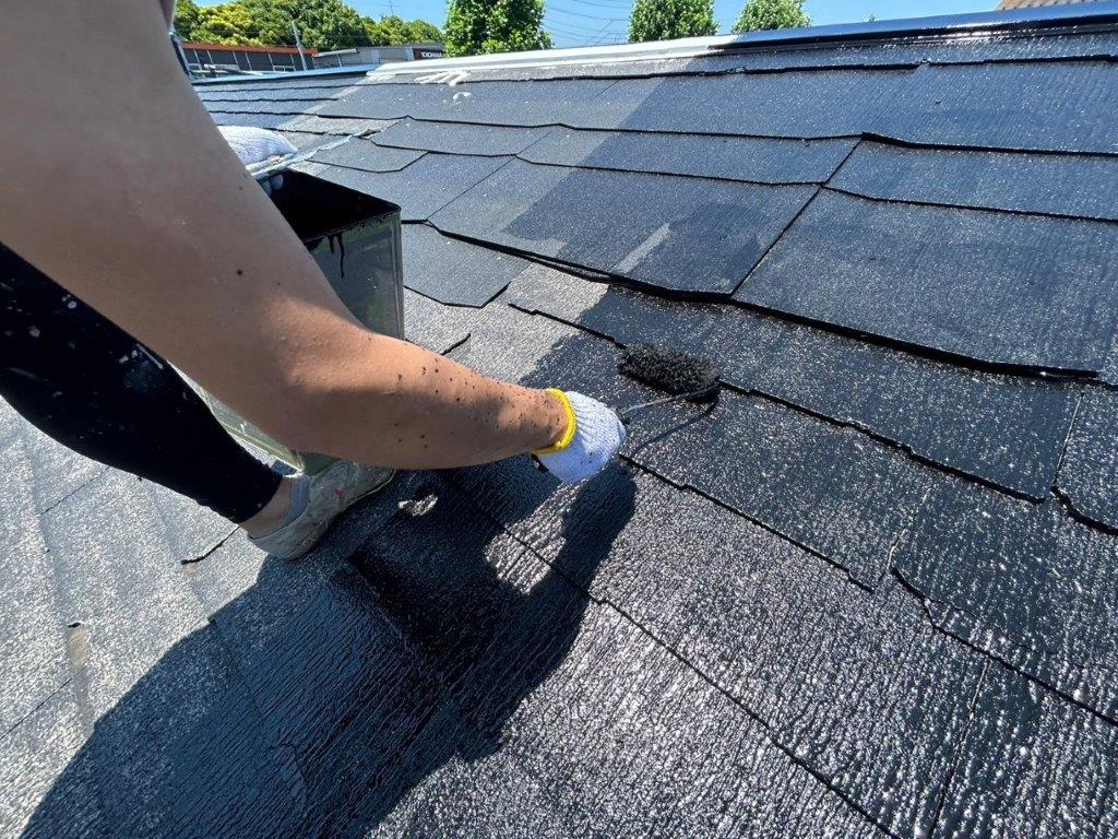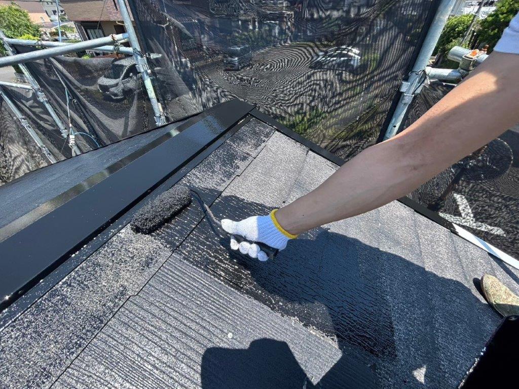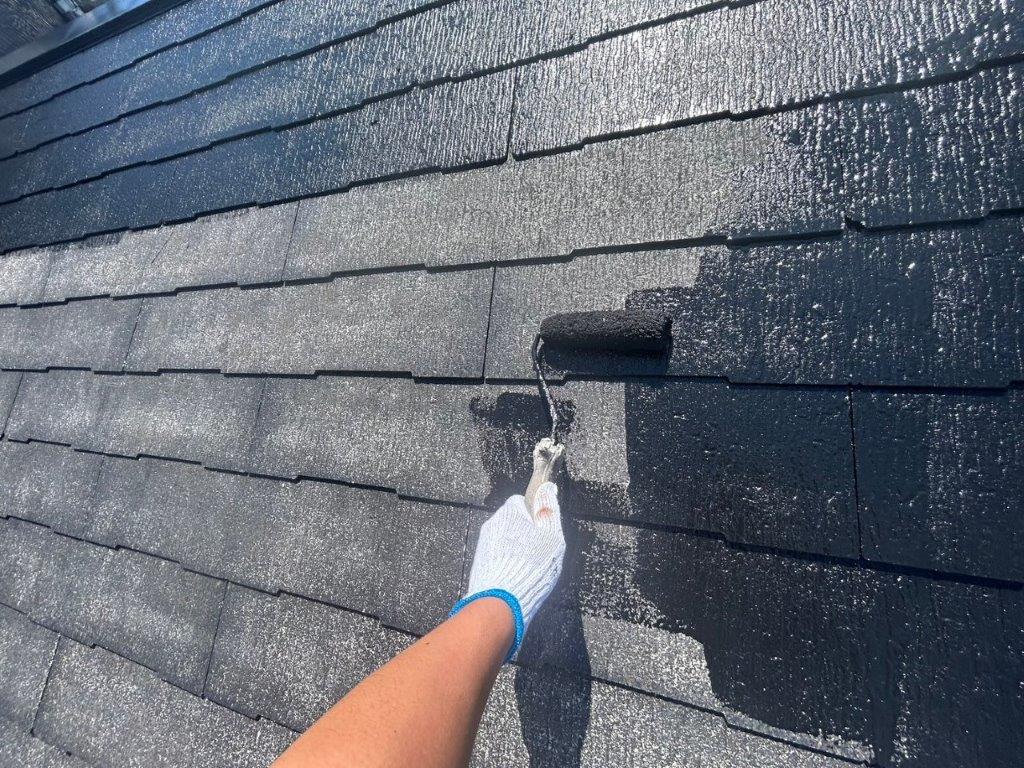 スレート屋根の中塗り塗装(主材1回目の塗布)|千葉市花見川区の戸建て住宅にて塗り替えリフォーム中