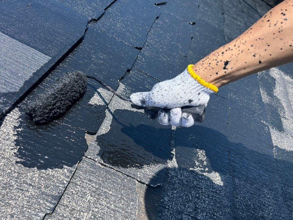スレート屋根の中塗り塗装(主材1回目の塗布)