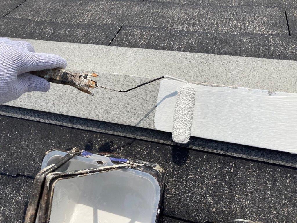 屋根の棟板金等は雨風の影響で錆びが発生しやすい場所なので、塗装する前に必ず錆び止め材を塗布します。