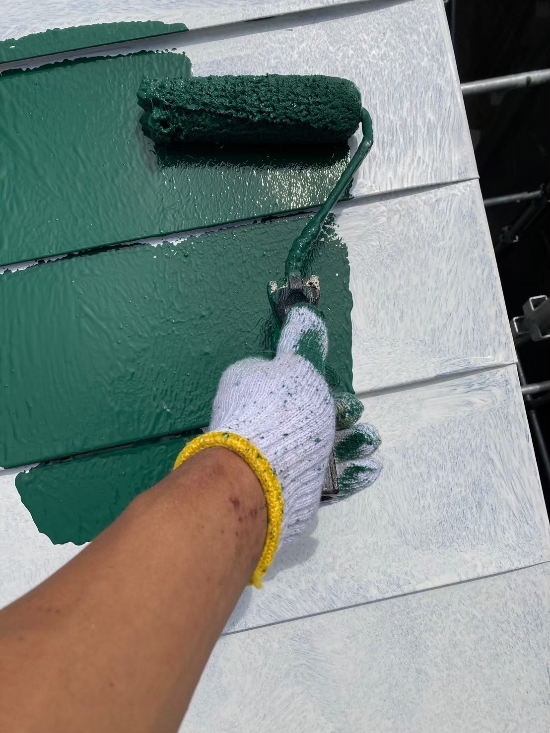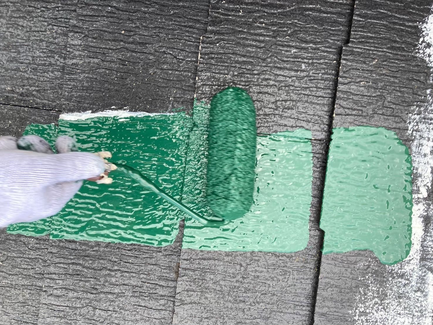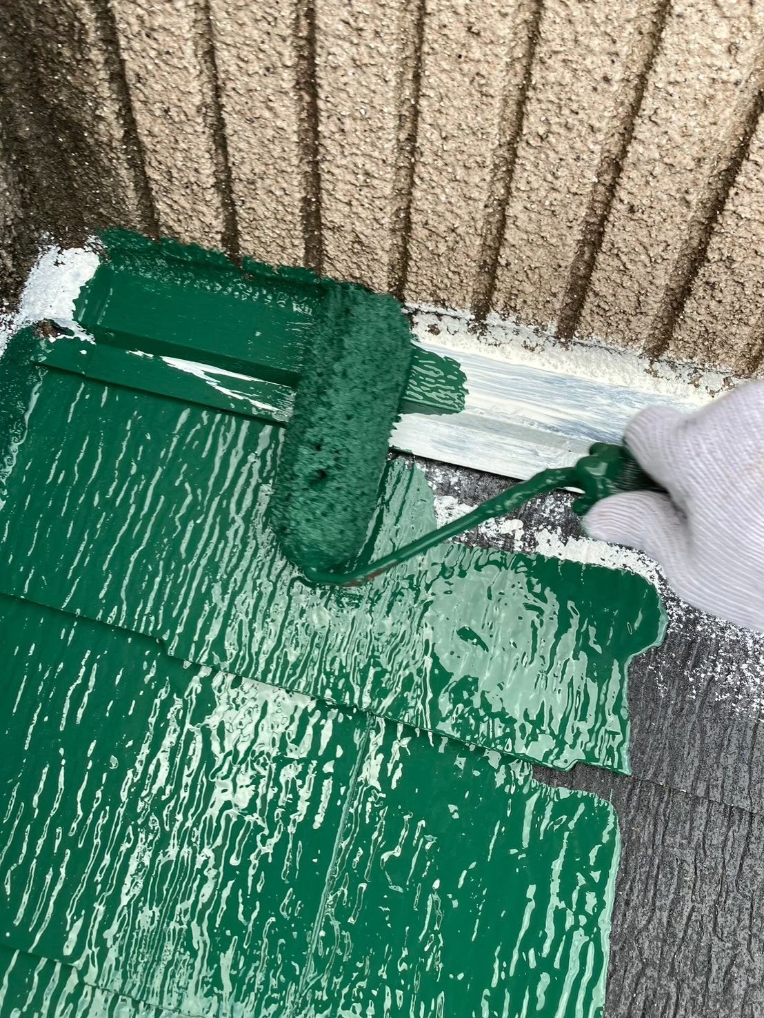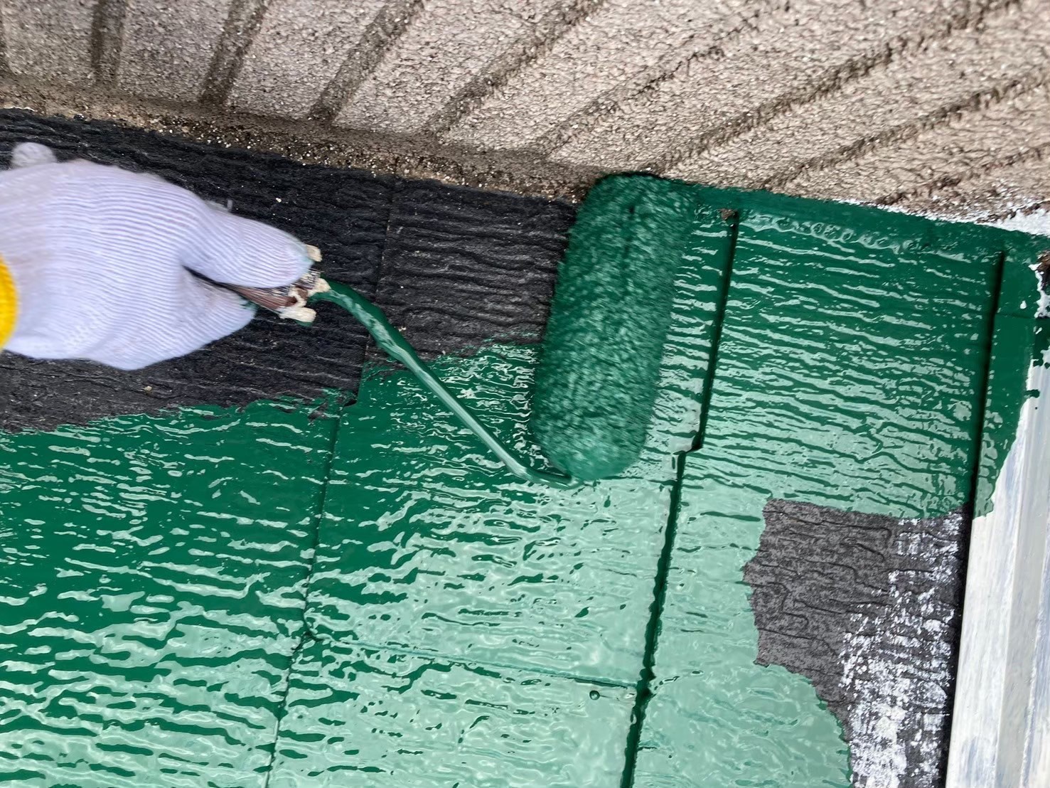 屋根の中塗り塗装(主材1回目の塗布)