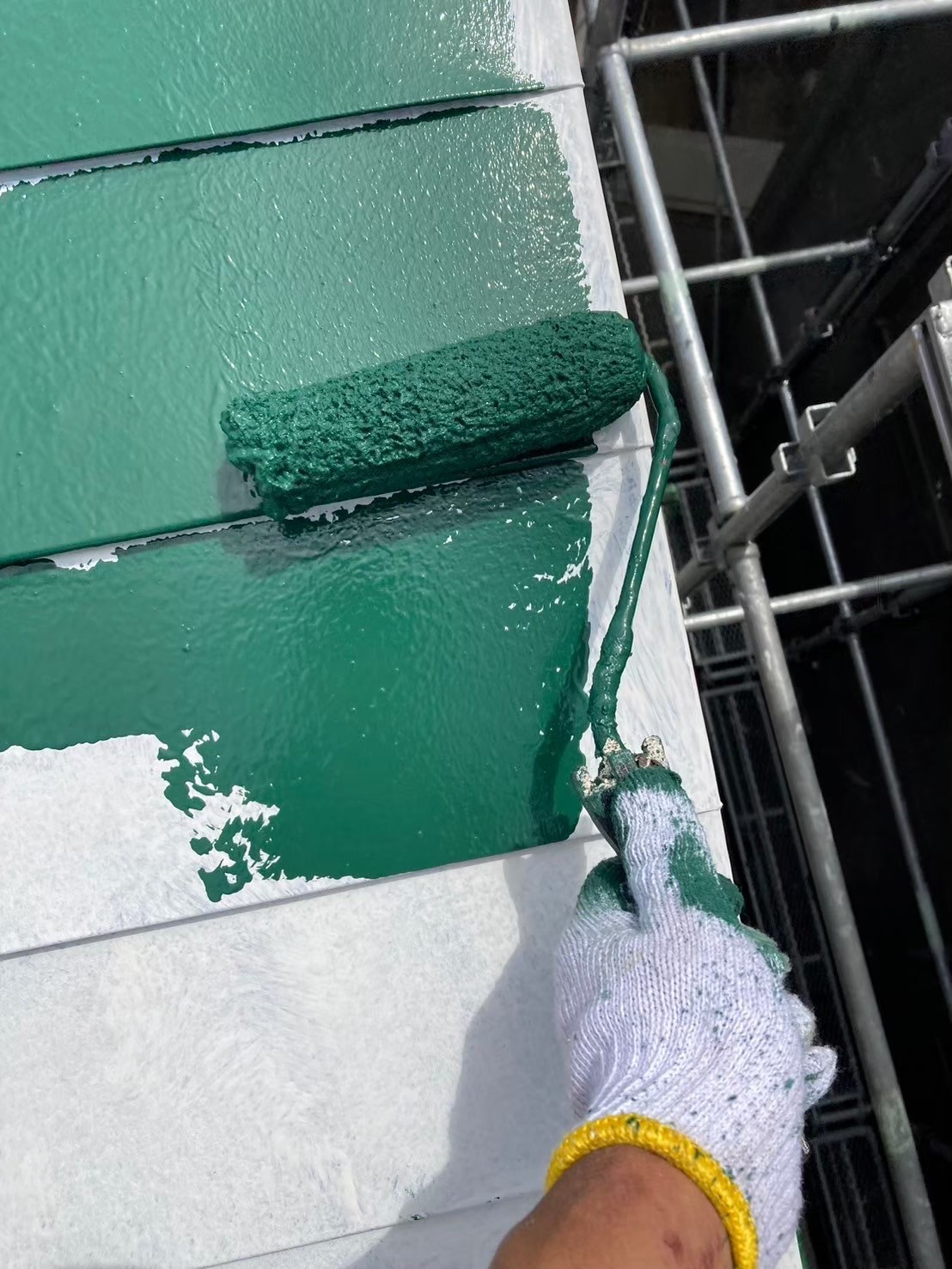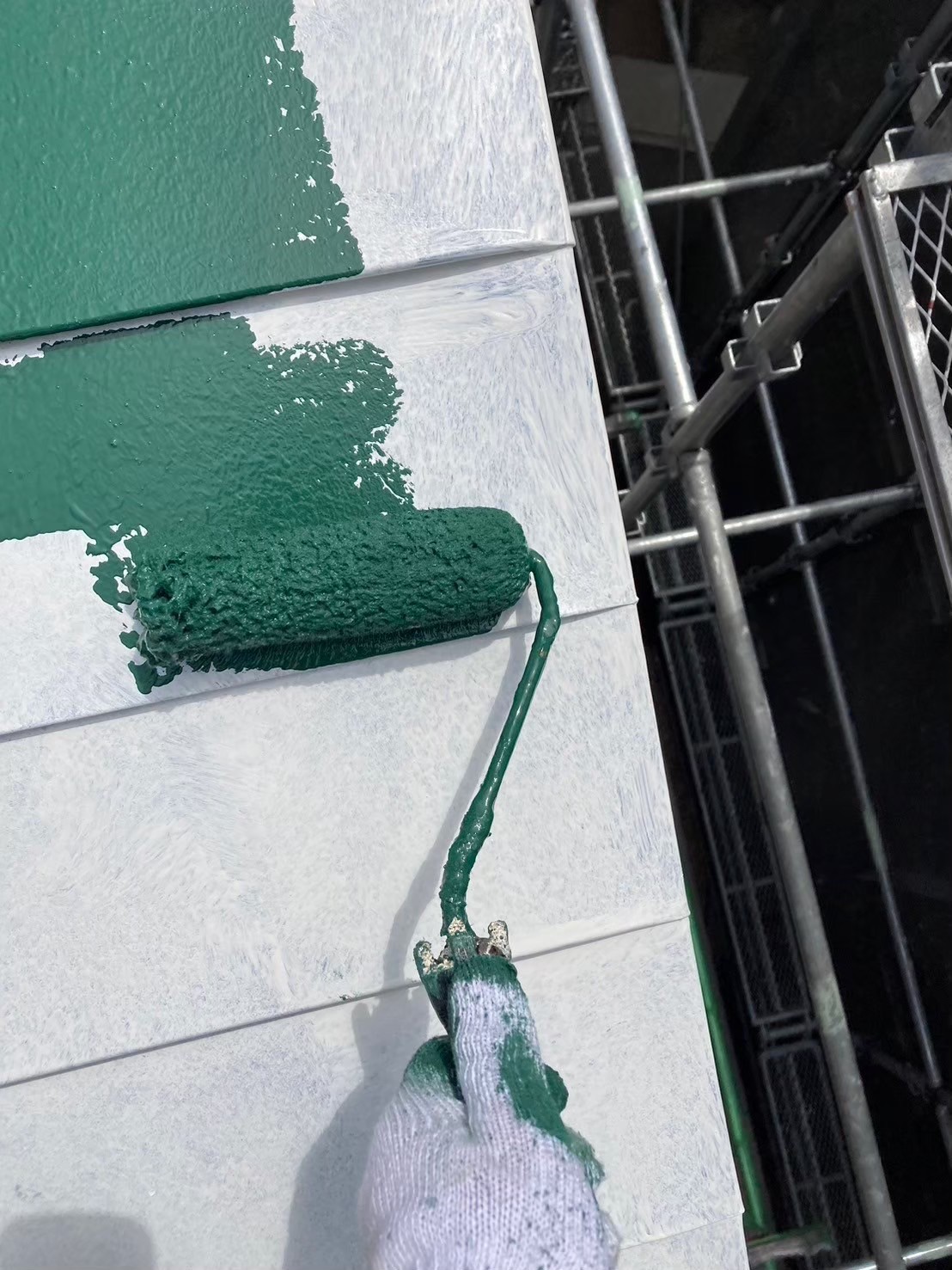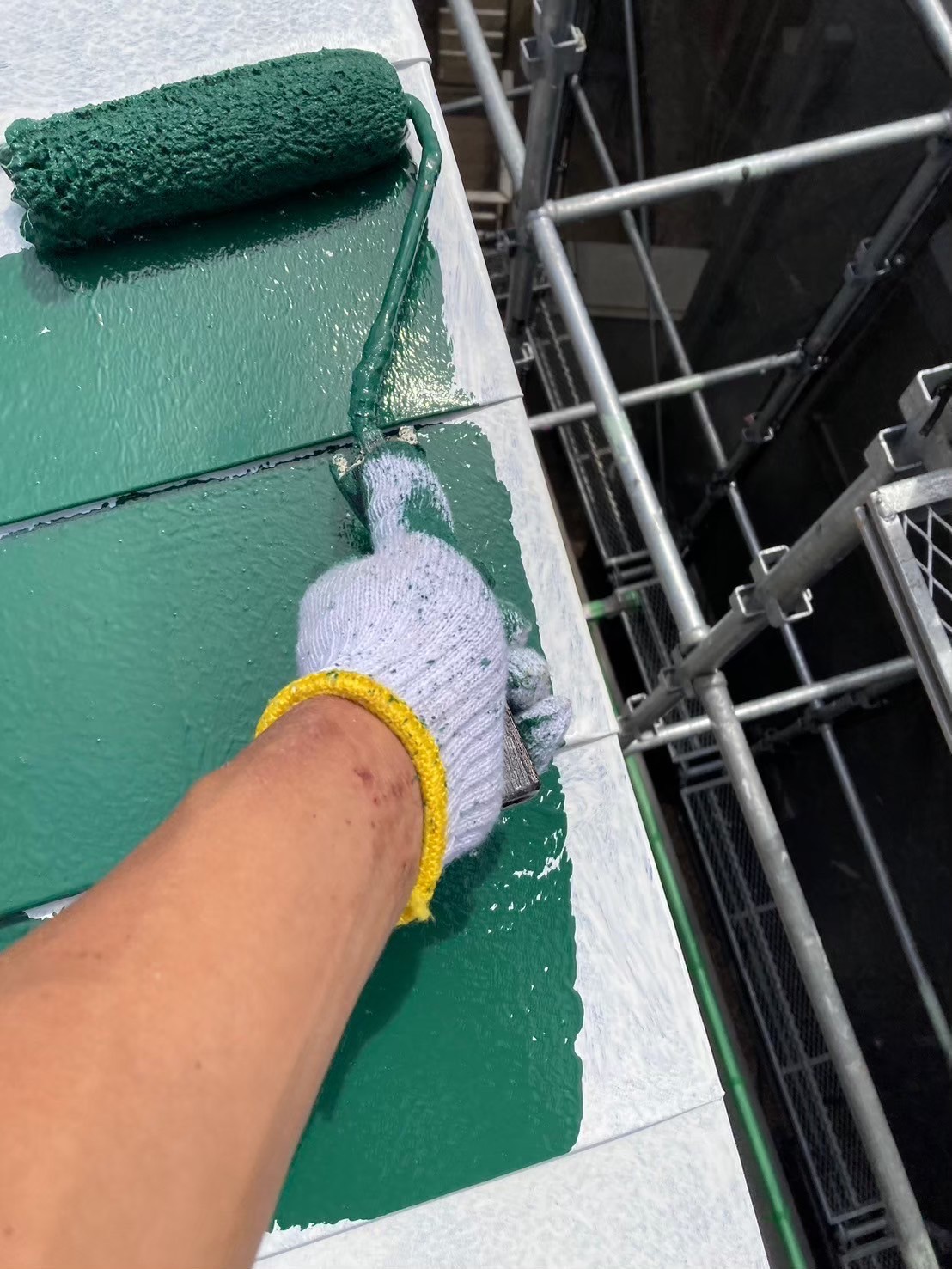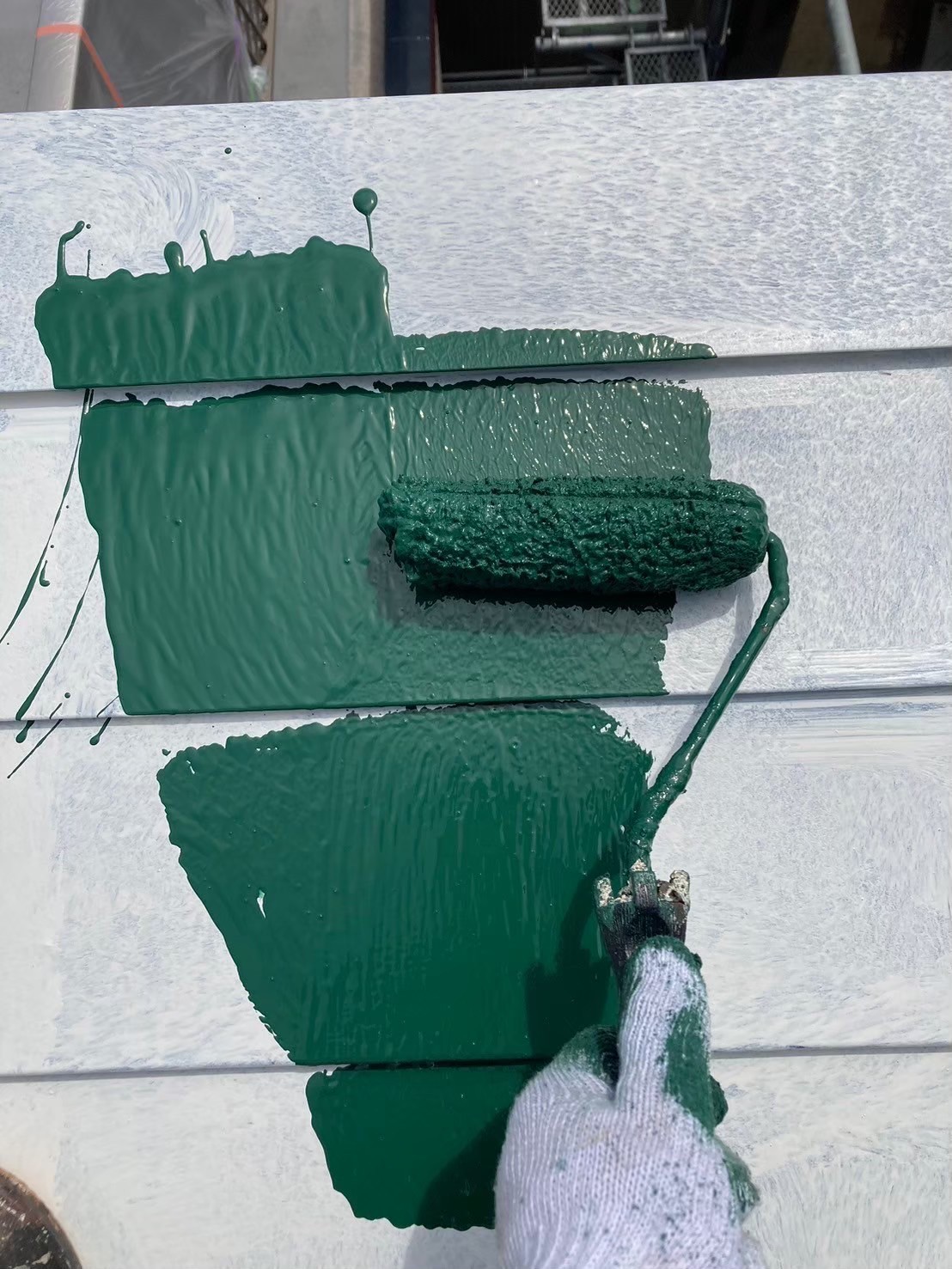 屋根の中塗り塗装(主材1回目の塗布)