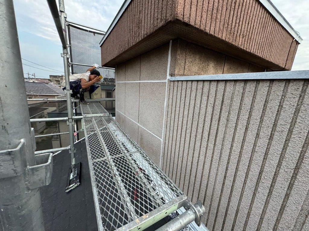 【千葉市花見川区】戸建て住宅モルタル外壁の上塗り塗装|主材2回目による最終仕上げ工程