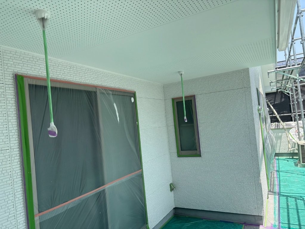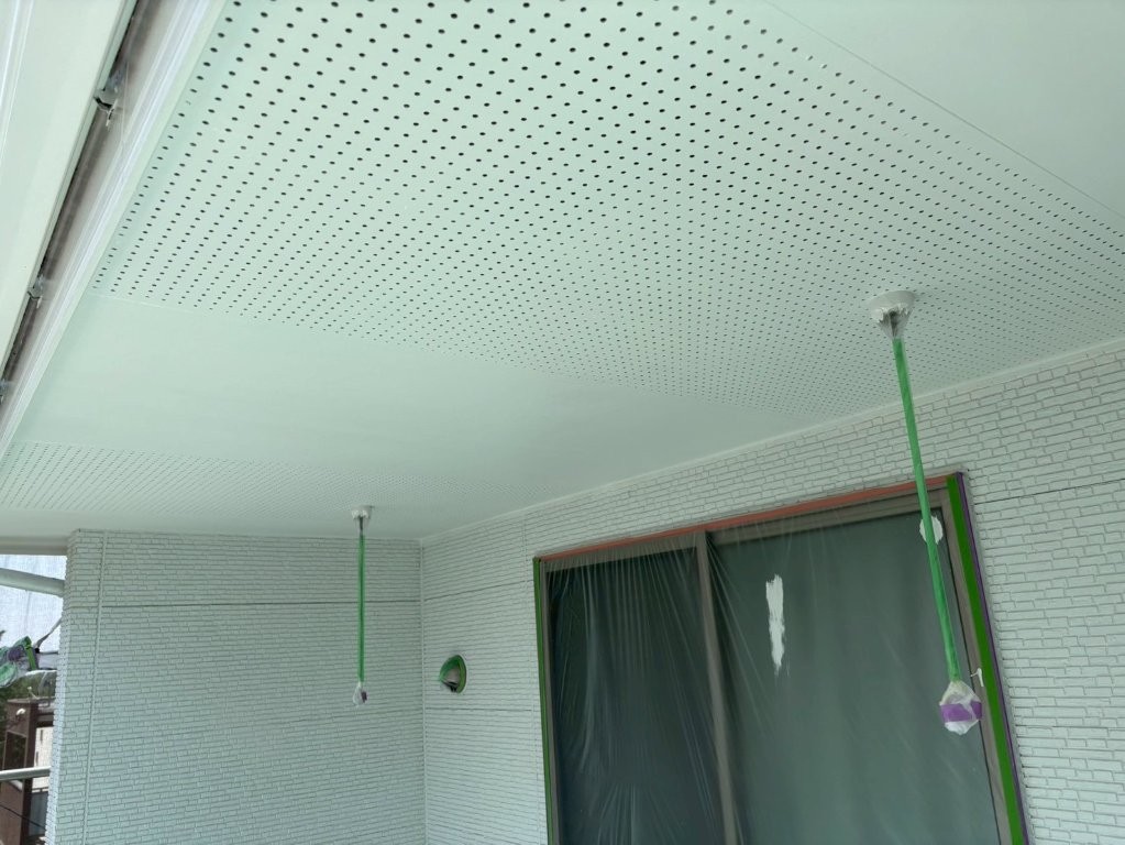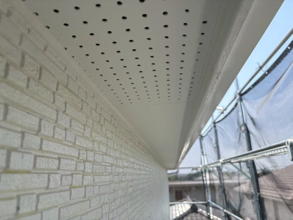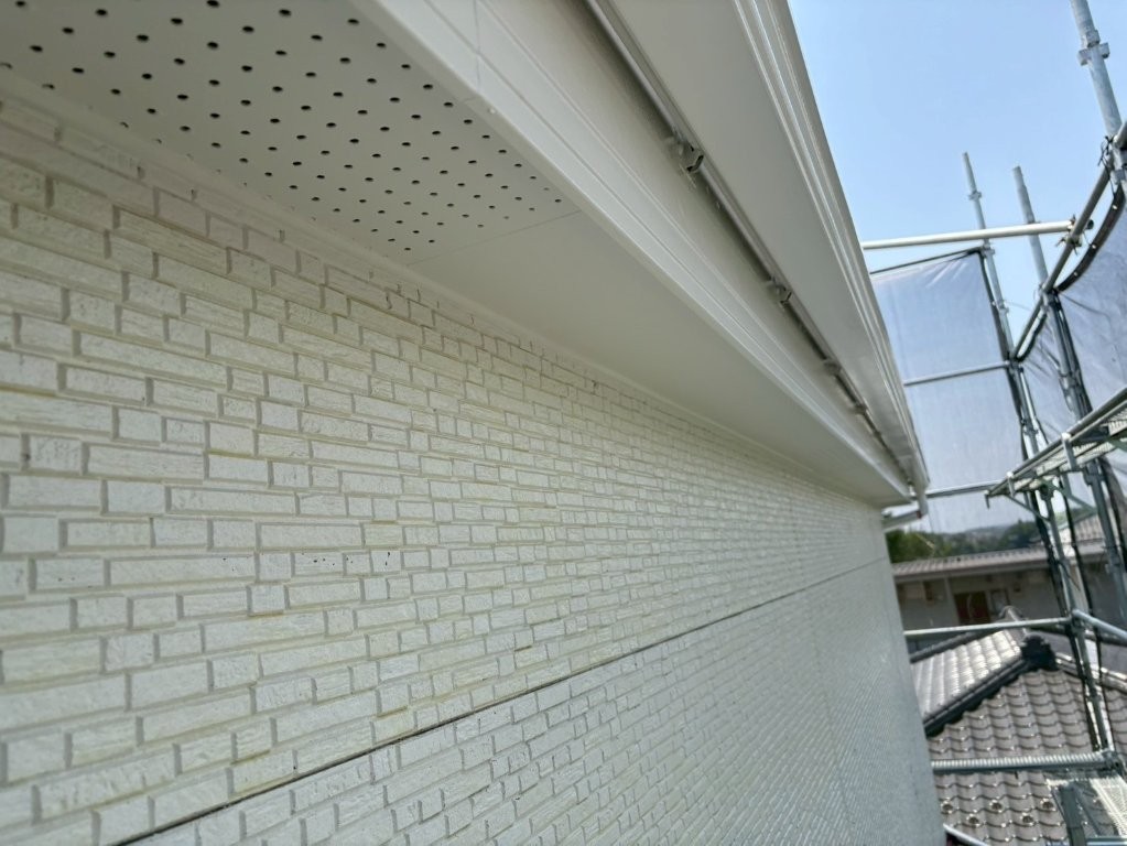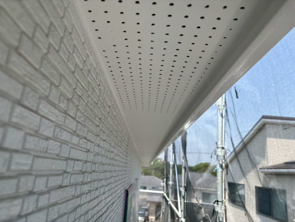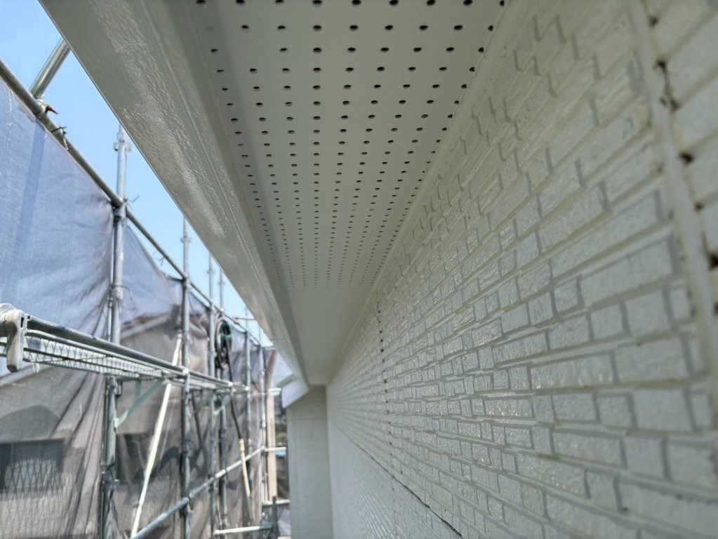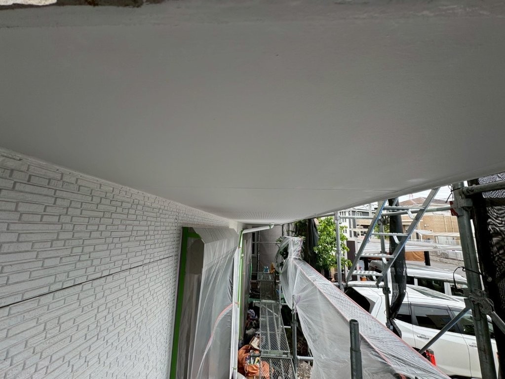 上塗り完了後の軒天は、均一でなめらかな白さと美しい光沢感を帯び、外観の印象を大きく高める仕上がりとなりました。