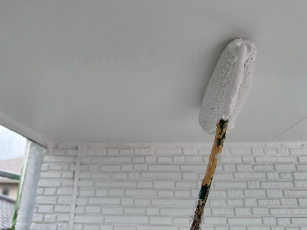 【施工中】軒天上塗り塗装の様子|細部まで均一に丁寧な塗布