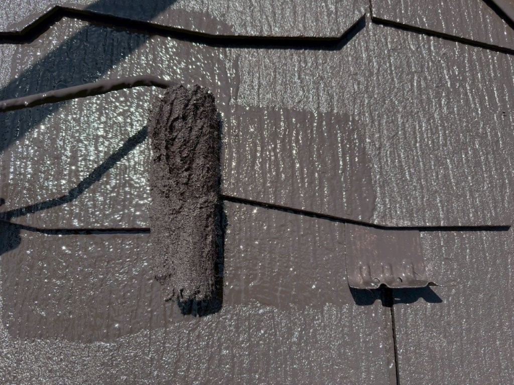 屋根材の重なり部や凹凸には塗料が入りにくいため、ローラーを押し当てる力加減を調整しながら塗布を行い、すみずみまで塗膜が届くよう丁寧に仕上げました。