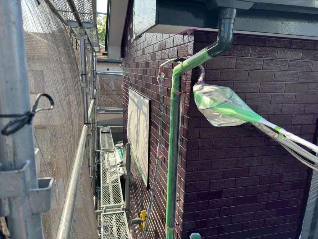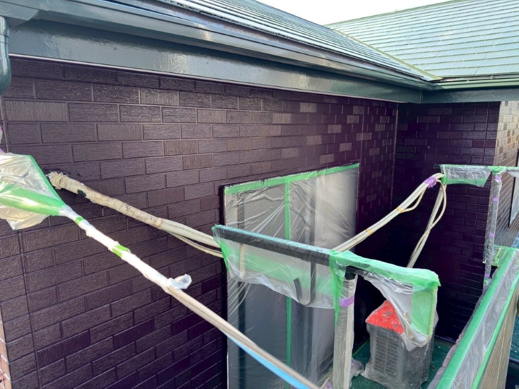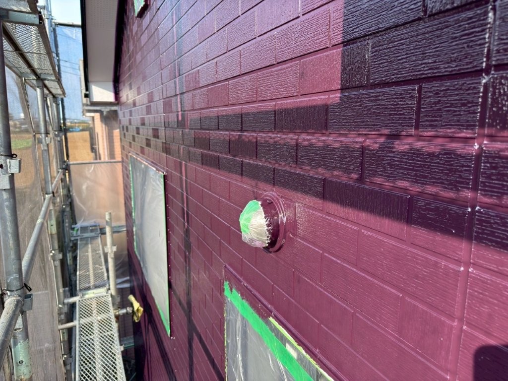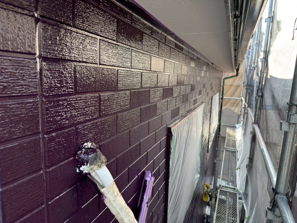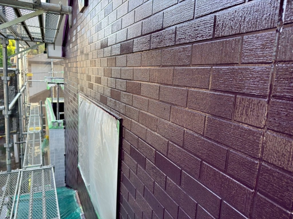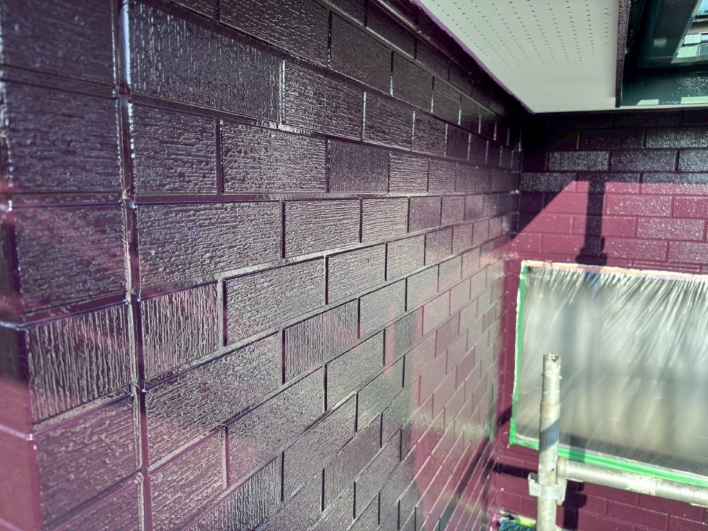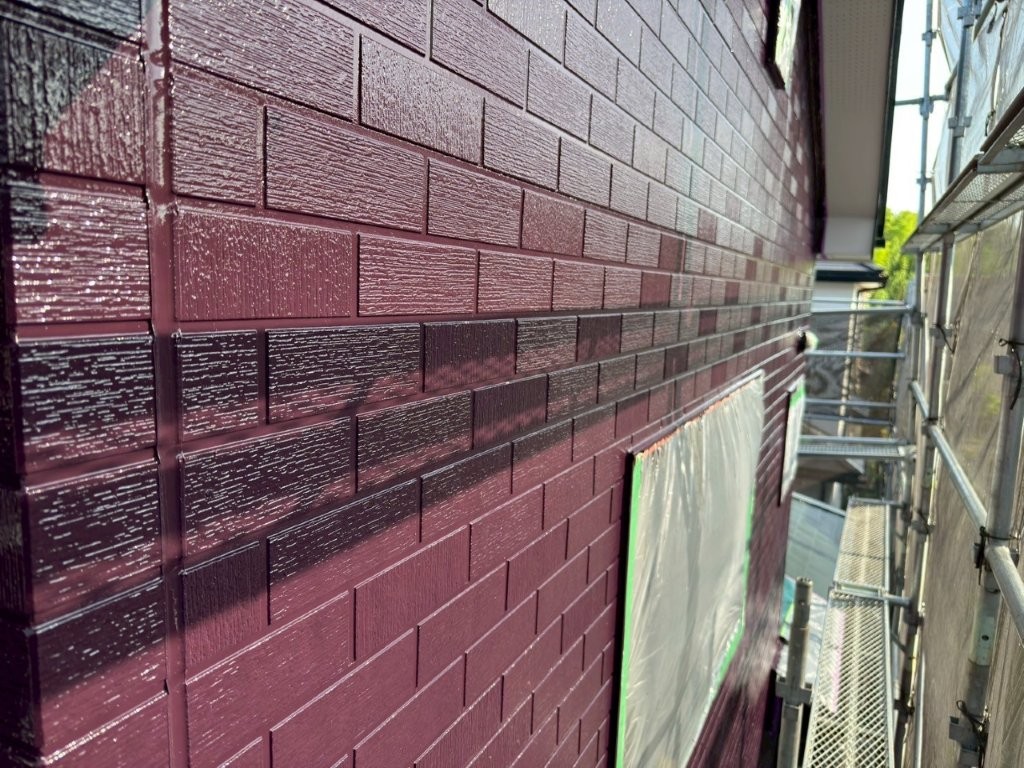 中塗り塗装完了後の外壁は、深みのあるワインレッド系カラーに染まり、美しい艶と重厚感を備えた仕上がりに。