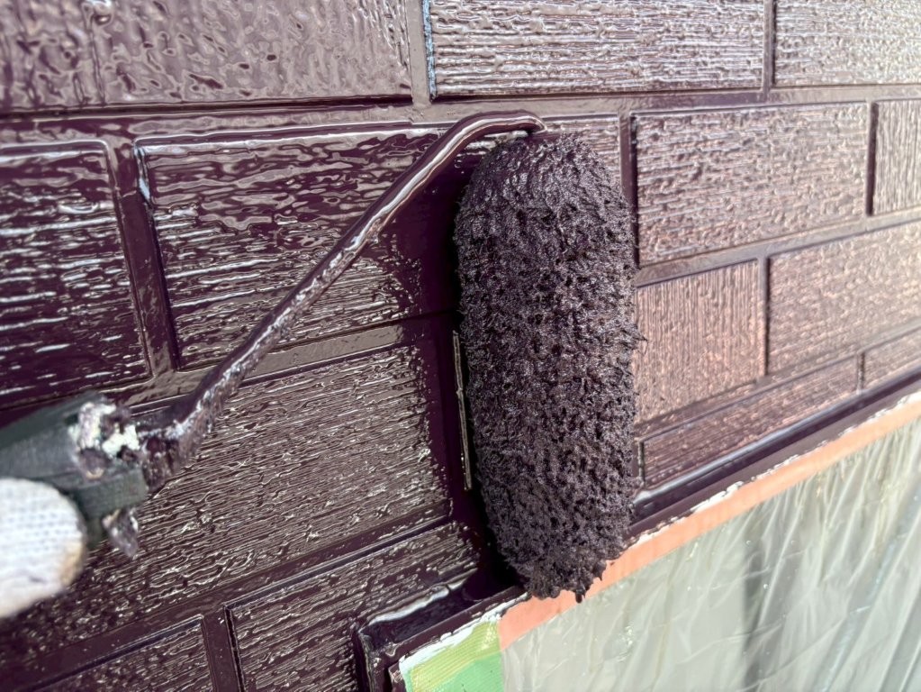 上塗りでは、中塗りと同じ主材を使用し、凹凸のあるサイディング面にしっかりと塗料を押し込むように、ローラーで丁寧に施工していきます。
