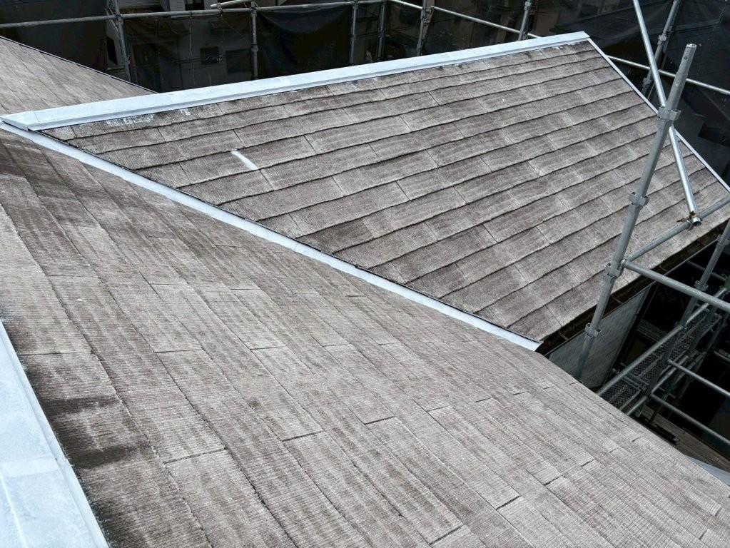 また、棟板金や谷板金といった金属部周辺については、塗り残しのないようにローラーと刷毛を使い分けて施工。塗料の飛散や垂れも発生しないよう、丁寧な手さばきが求められる場面です。