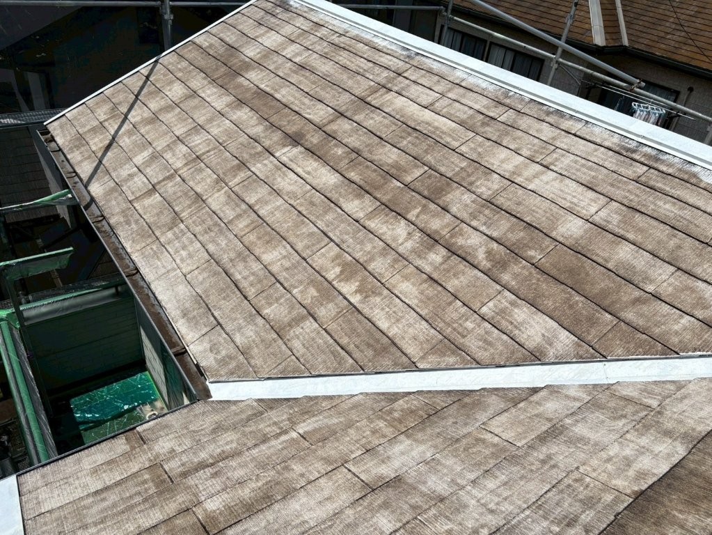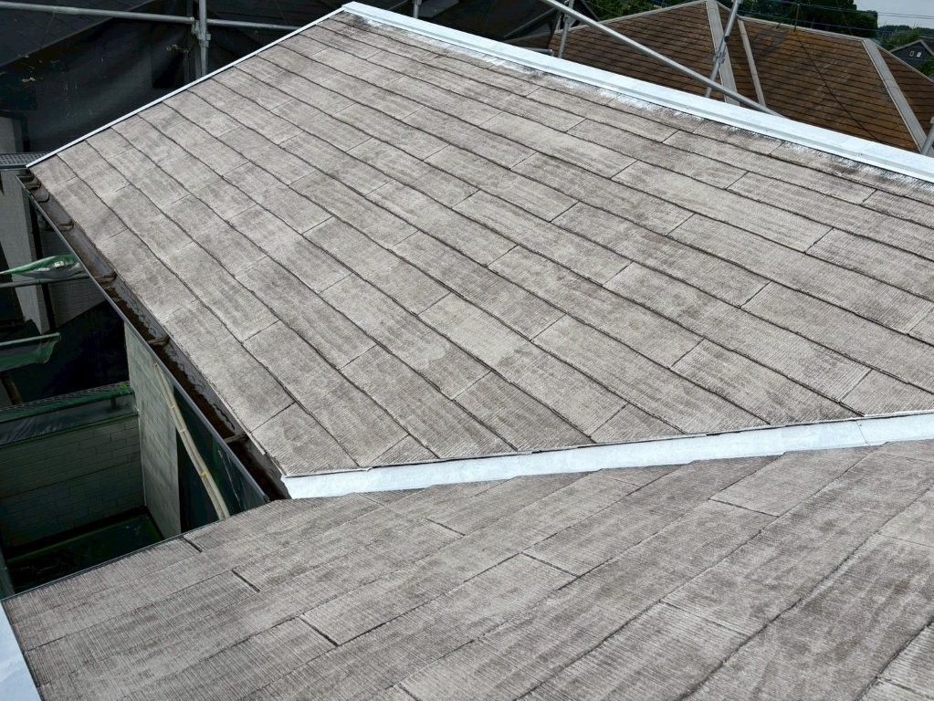 屋根全体に均一に塗布し、吸い込みが多い箇所には重ね塗りするなど、細かい部分まで配慮しながら作業を行いました。