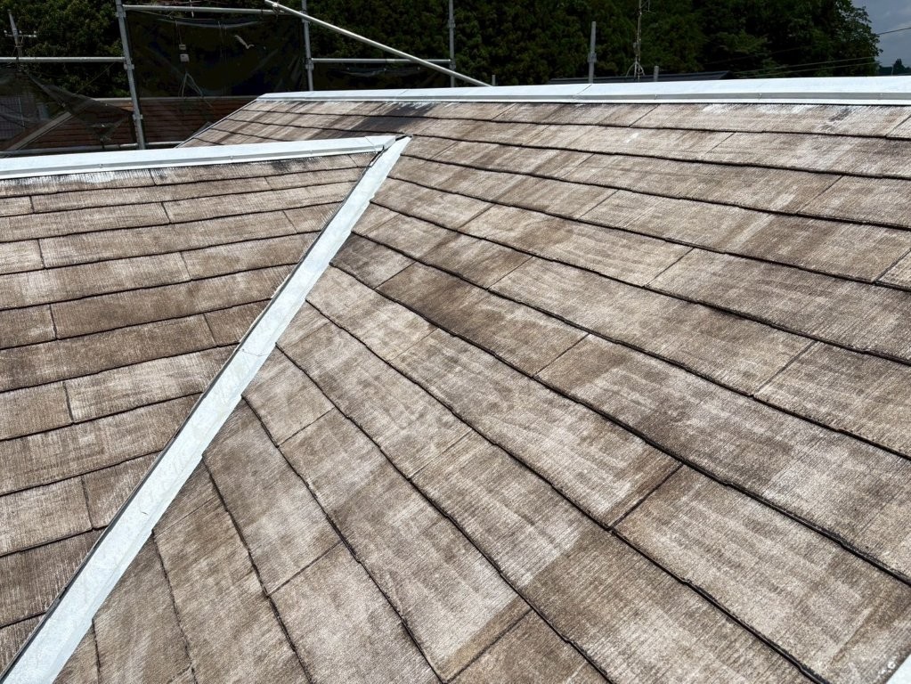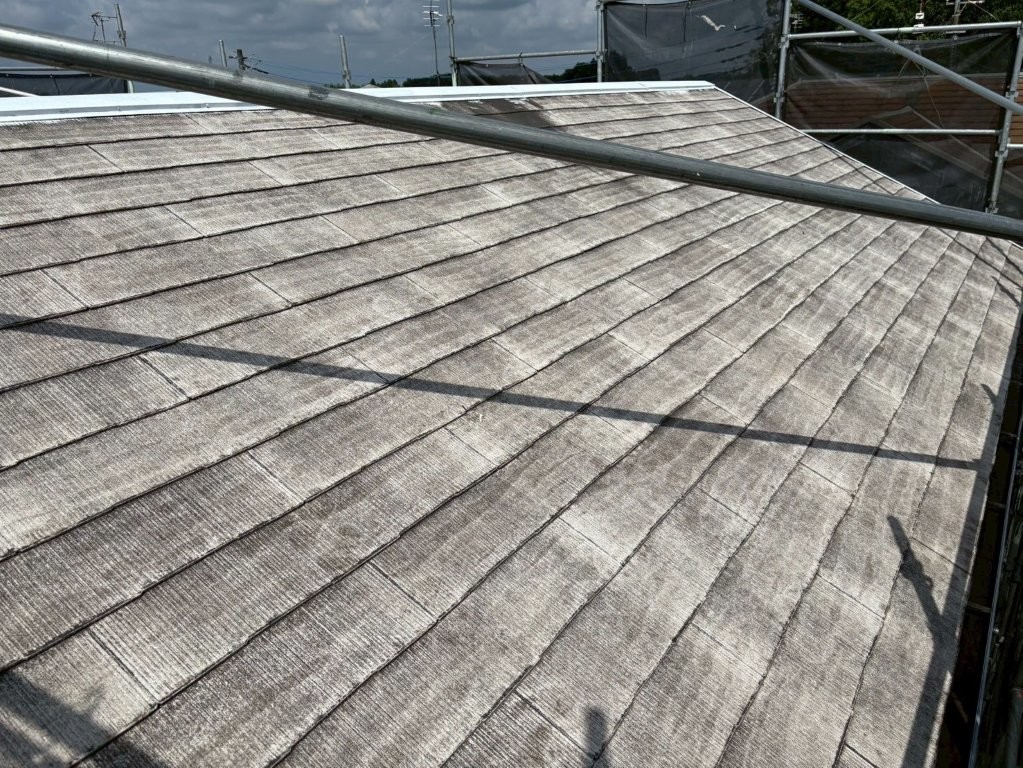 屋根材の表面は、長年の風雨や紫外線によって防水性がほとんど失われ、表面を指でこすると白い粉(チョーキング現象)が出る状態。これは、下塗りの吸い込みが激しくなる予兆でもあります。