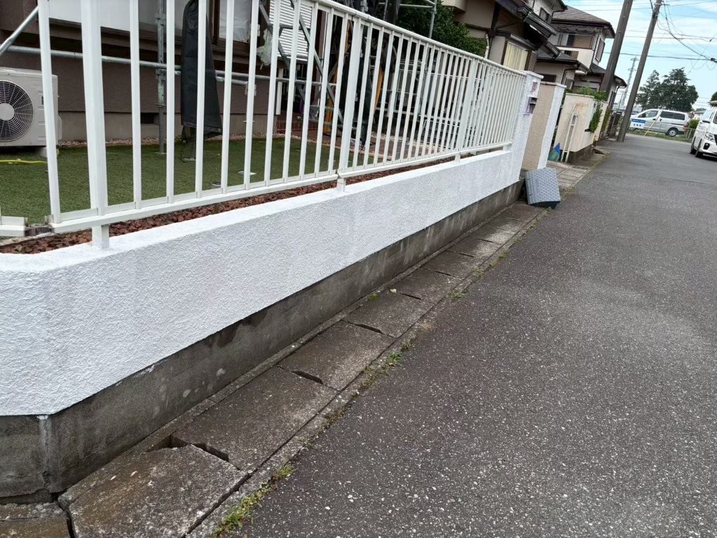 下塗りを終えた塀は白く均一に整っており、下地の吸い込みも止まった理想的な状態でした。