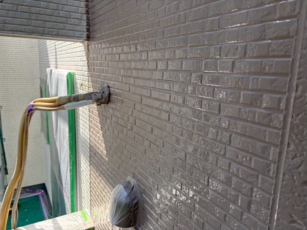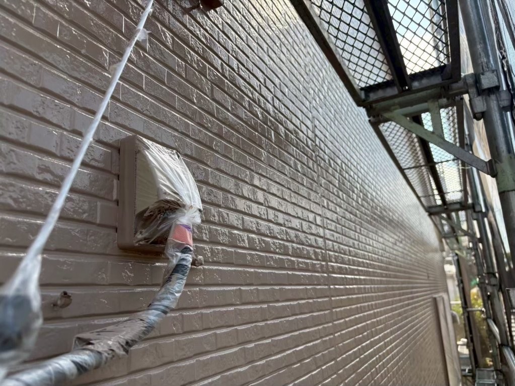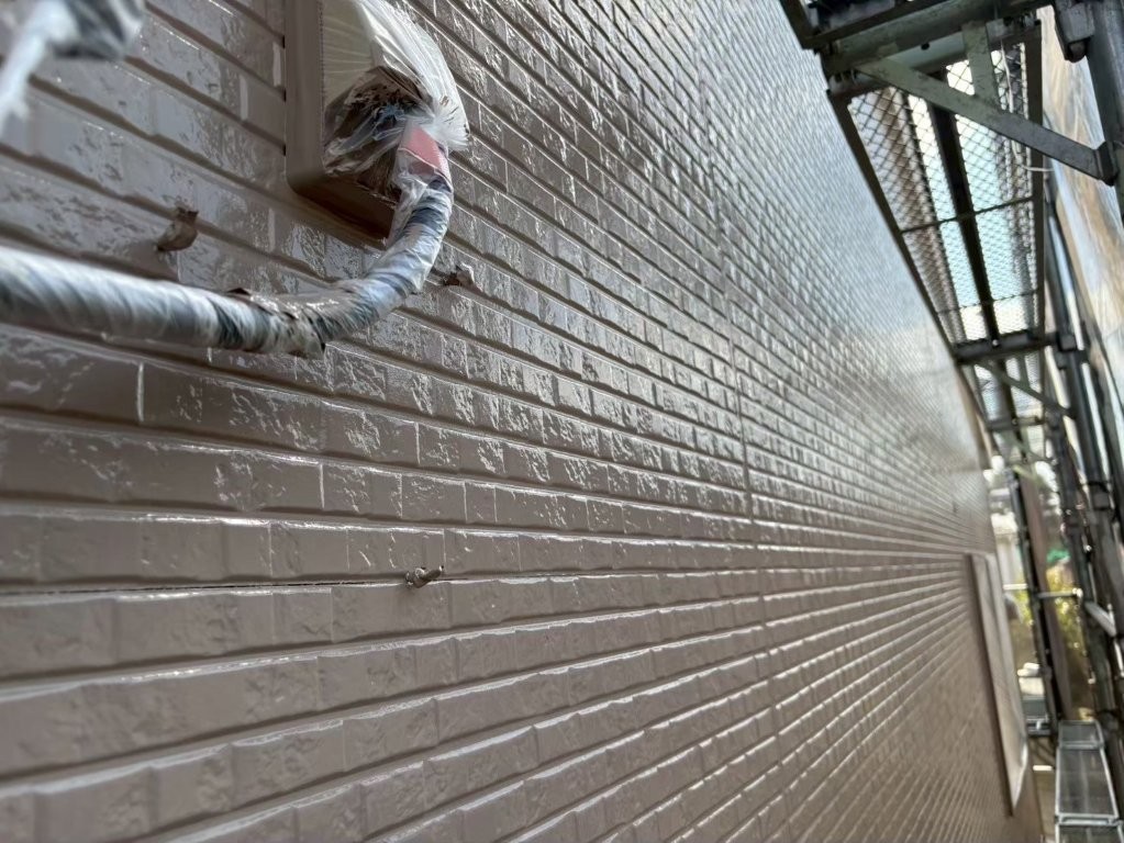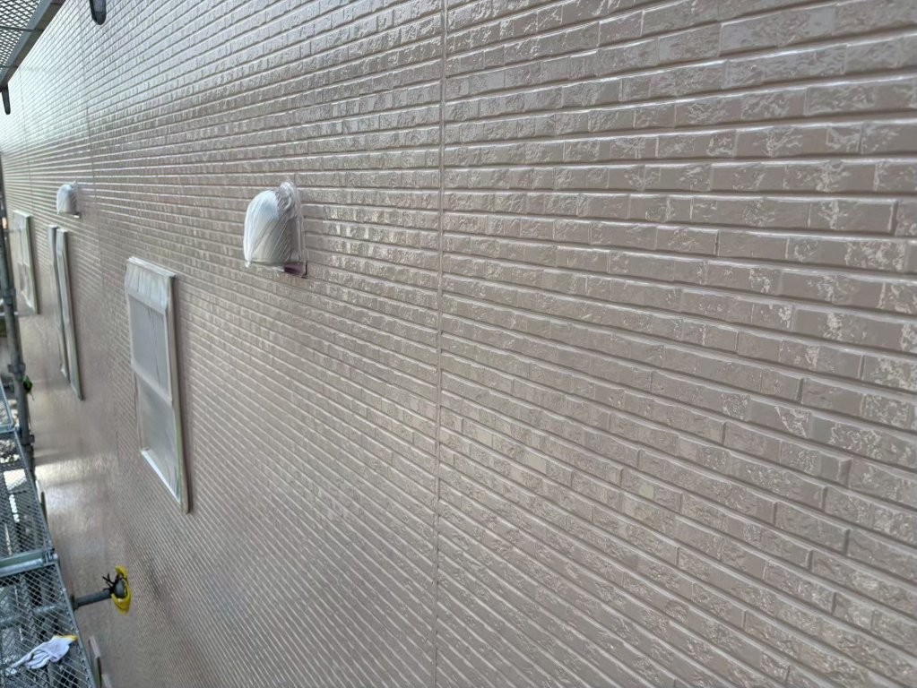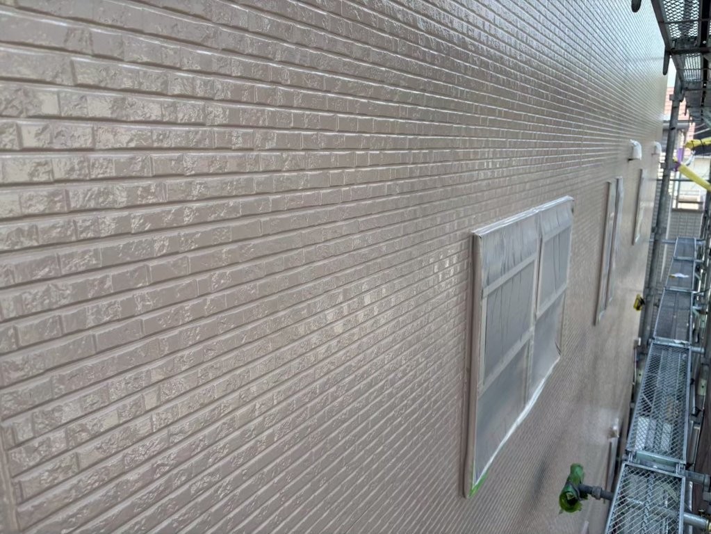 このあと行う上塗り(2回目の主材塗布)で、「色の深み」「艶の持続性」「耐久性」のさらなる強化が仕上がり、S様邸の外壁が長く美しさを保てる状態になります。