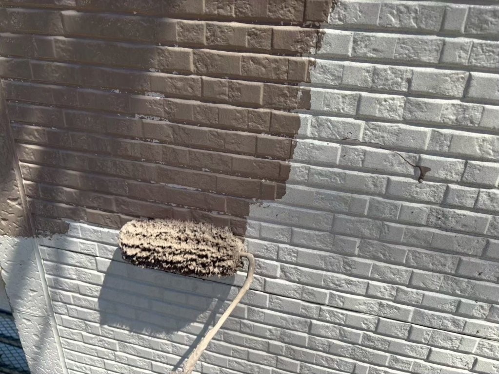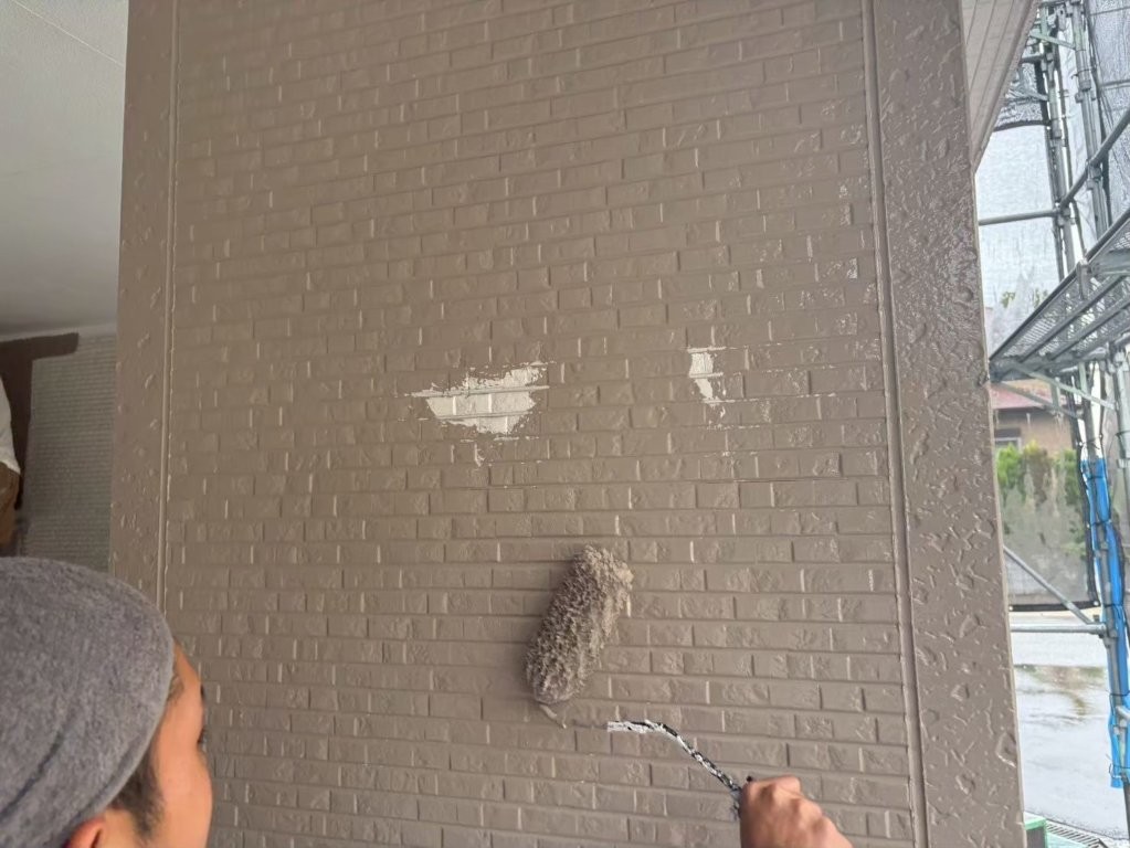 外壁の凹凸部分に対し、ローラーをしっかり押し当てながら上下左右に動かし、塗り残し・透け・気泡が出ないよう細かな調整を行いながら塗布 しています。