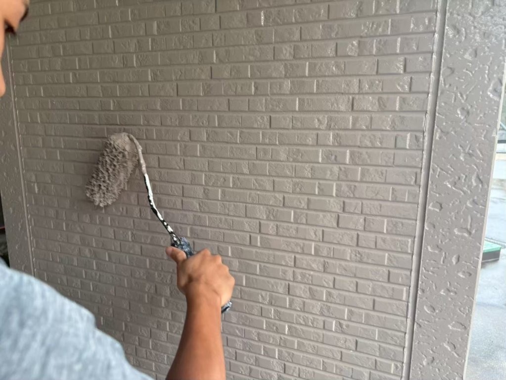写真のように、ローラーへたっぷりと塗料を含ませ、外壁の凹凸にしっかり押し当てながら塗布していきます。