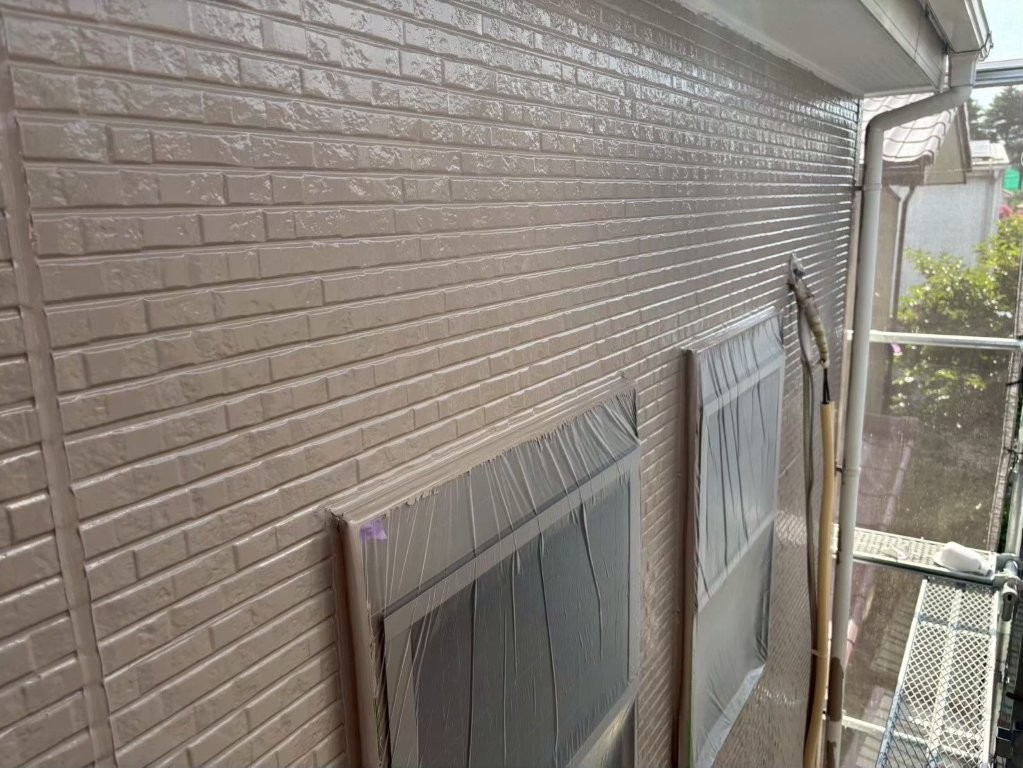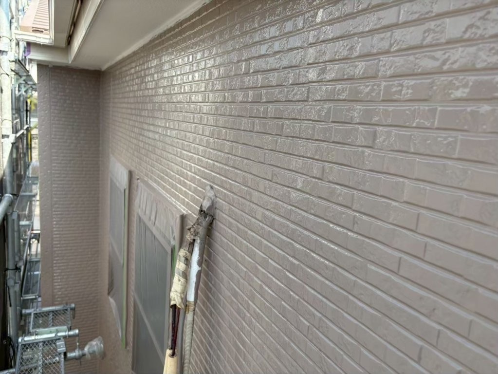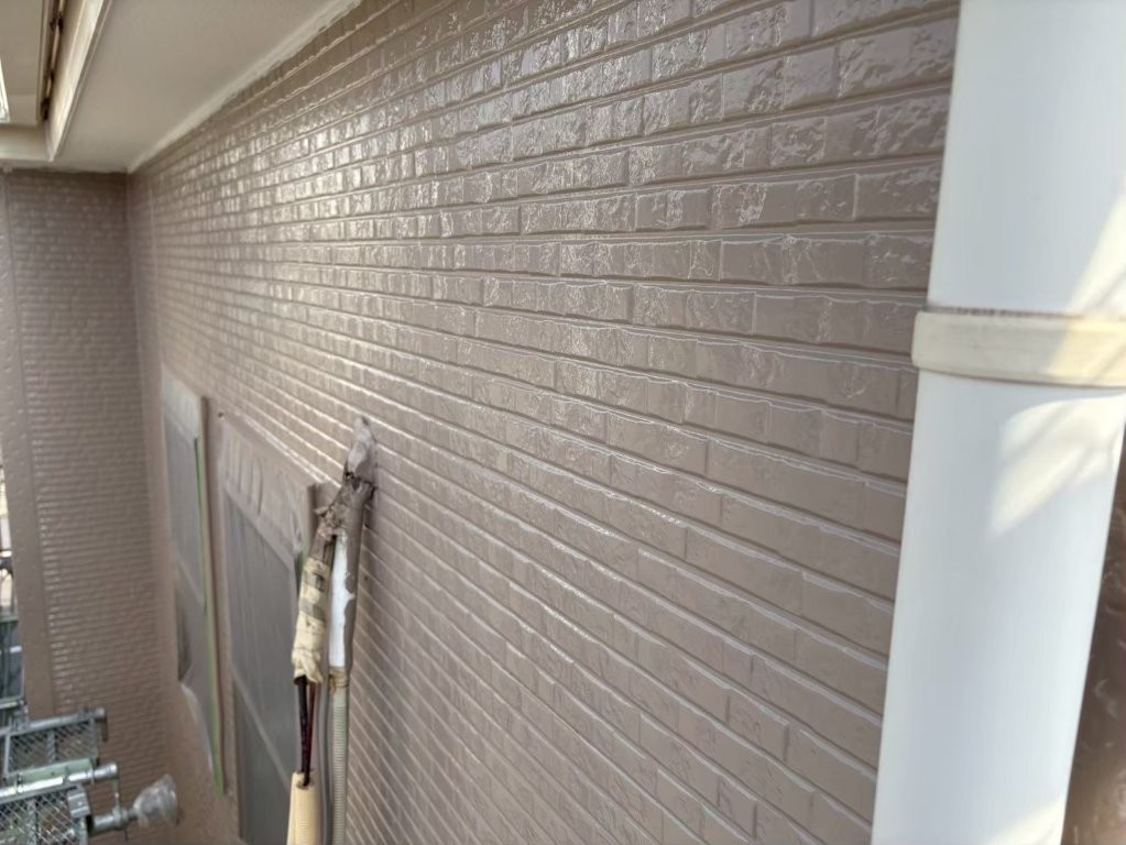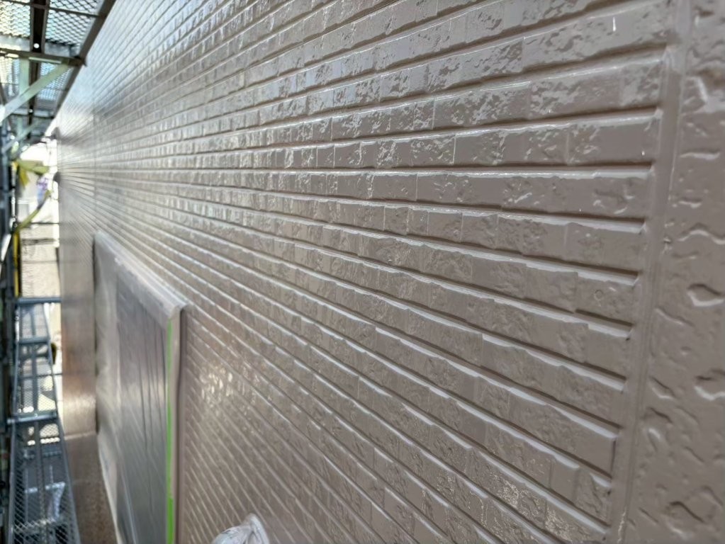 外壁全体に 艶のある均一な塗膜 が形成され、中塗り時よりも 色の深み・光沢・滑らかさ が一段と際立っています。