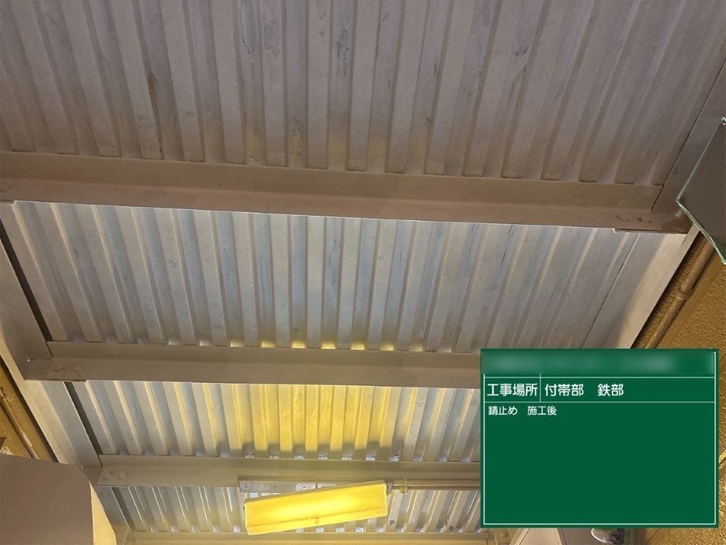 写真のように、梁の側面や波板の細かな溝、さらにボルトまわりまで丁寧に塗料を行き渡らせることで、鉄部全体を均一に保護する“防錆皮膜”が形成され、錆の再発をしっかり抑えることができます。