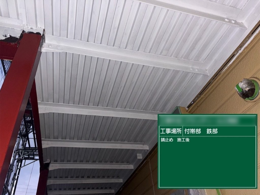 施工後は鉄骨全体が明るい色で均一に整い、旧塗膜の剥がれが完全に処理された安定した下地が完成しました。
