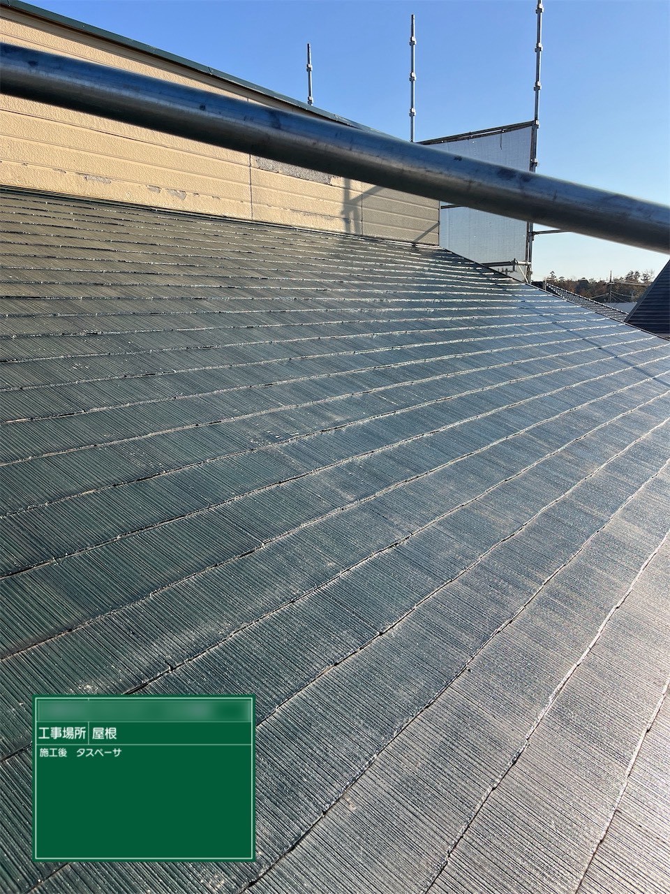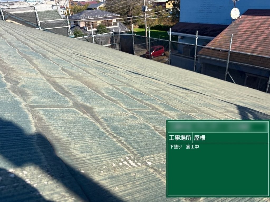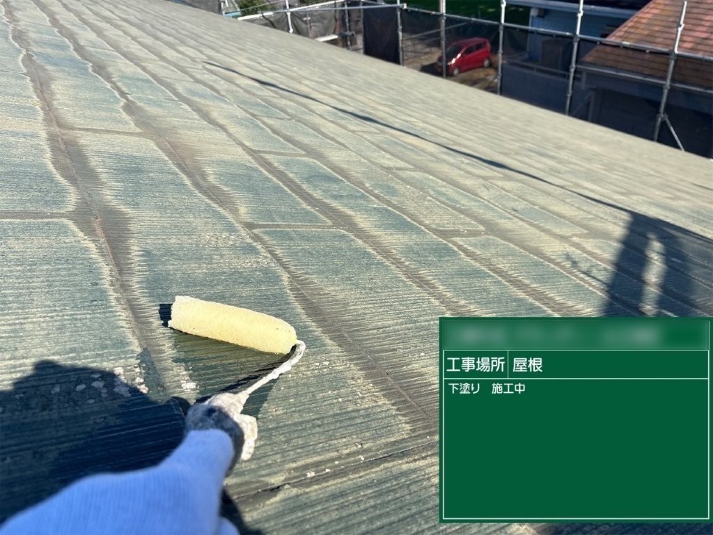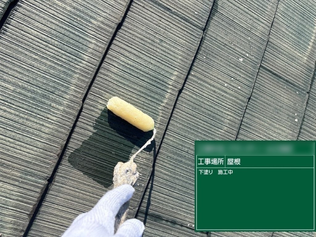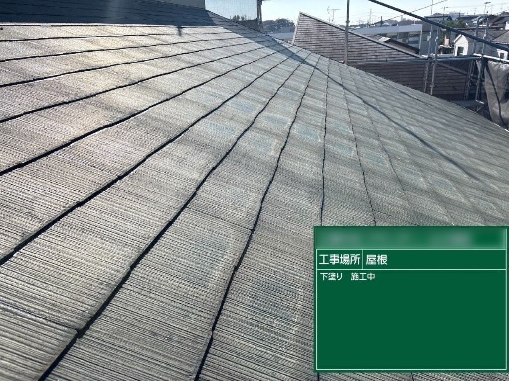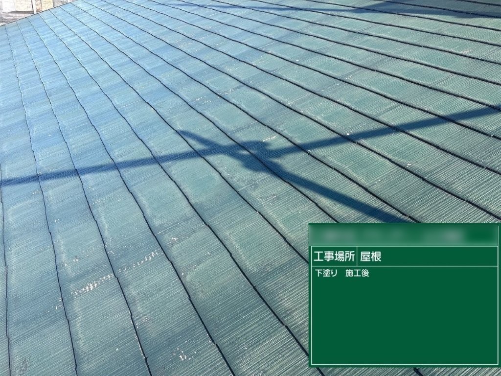 下塗り完了後の写真からは、屋根全体の色調が均一に整い、塗料の極端な吸い込み跡も見られず、次の工程へ進むための安定した下地状態が確保されていることが確認できます。