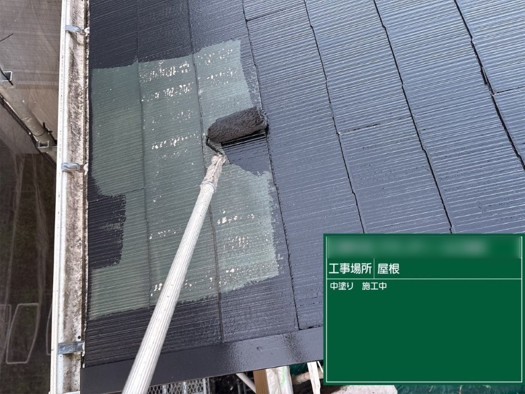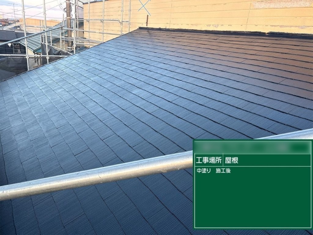 中塗り完了後の写真では、屋根全体の色調が揃い、大きなムラや透けが見られない状態が確認できます。