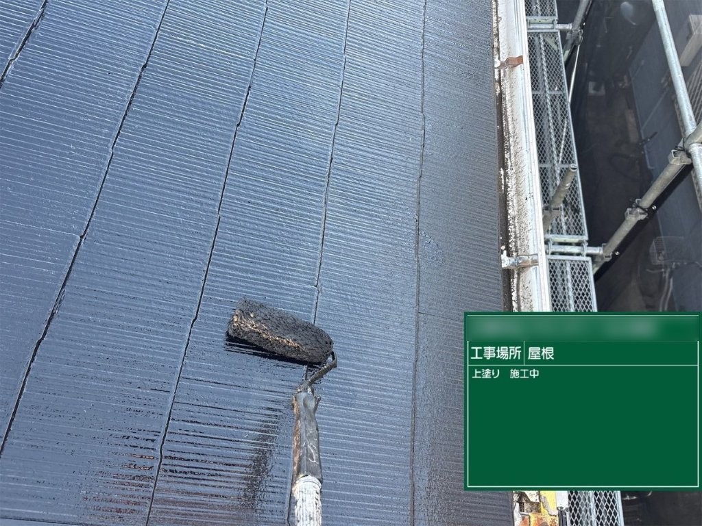 上塗り塗装中|屋根塗装の性能と見た目を完成させる工程
