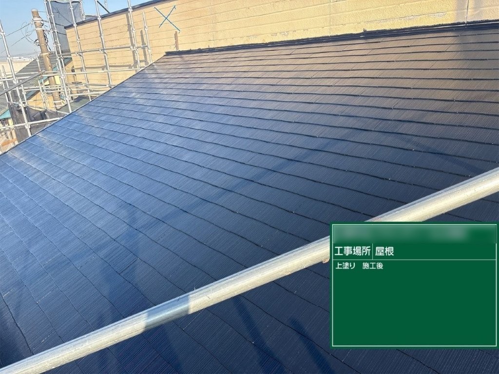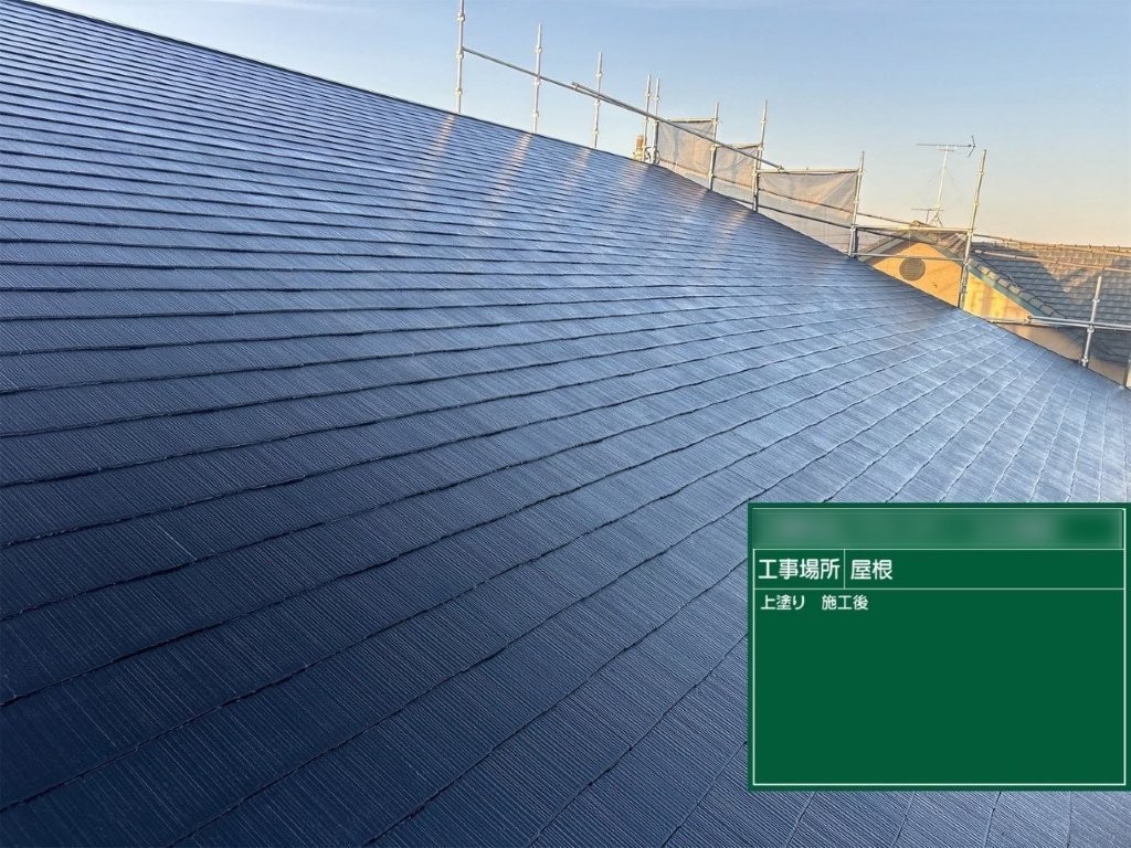 上塗り完了後の写真では、屋根全体が均一な色調と艶でまとまり、スレート屋根のラインがきれいに整っている状態が確認できます。