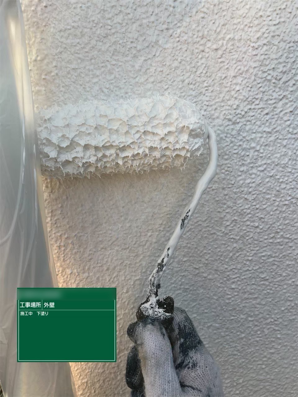 下塗り塗装(フィラー塗布)は、ローラーを使用して外壁の凹凸へ塗料をしっかり押し込みながら進めます。
