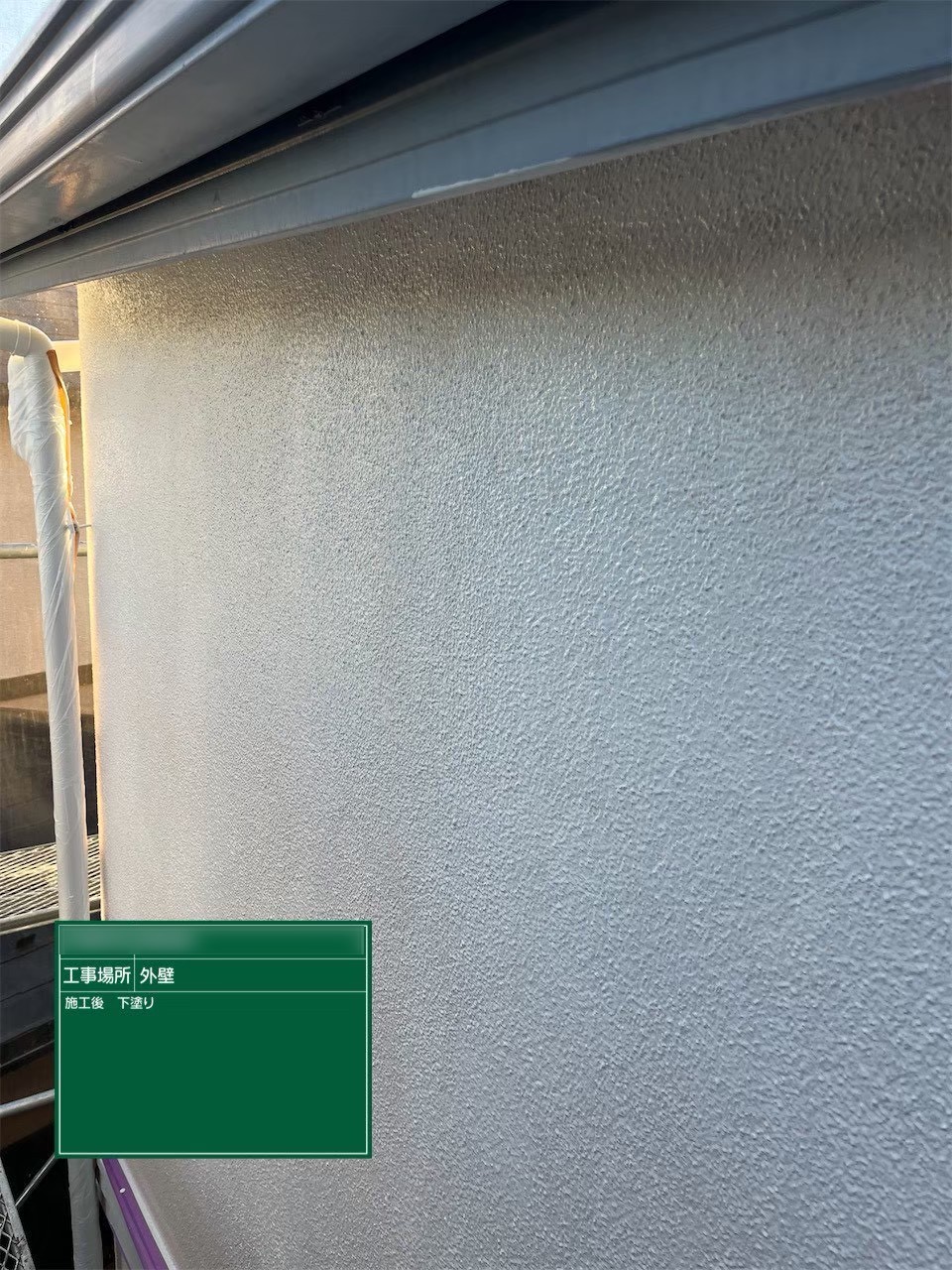 下塗り完了後は、外壁全面が白色のフィラーで均一に覆われ、モルタル外壁の色ムラが解消された状態になります。