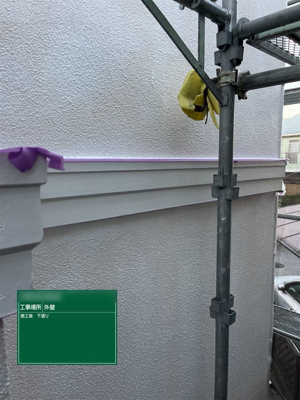 ④ 下塗り塗装後|外壁全体が白色フィラーで覆われ、下地が均一に整う