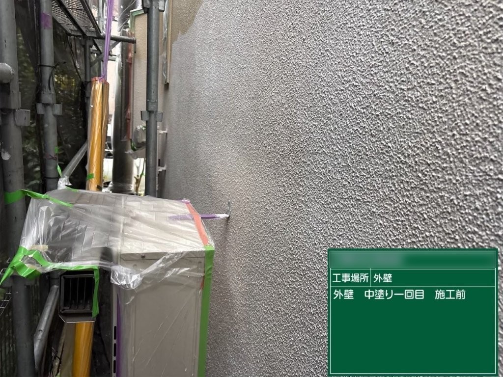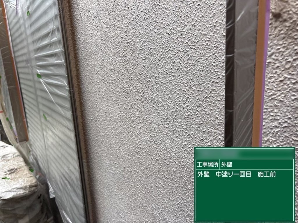 中塗り前の外壁は、白色のフィラー下地が均一に形成され、モルタルの凹凸模様がはっきり確認できる状態でした。
