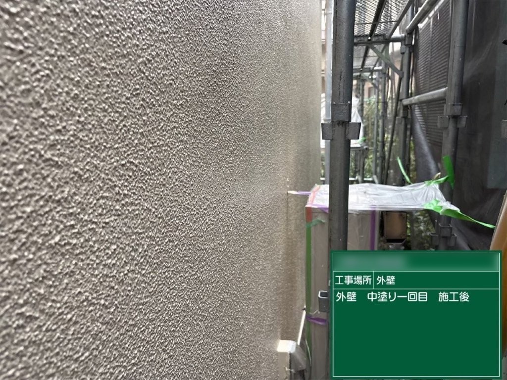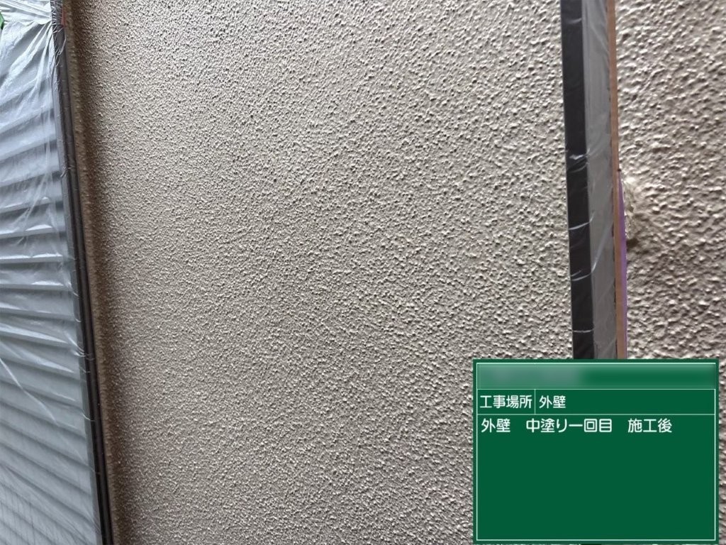 中塗り完了後は、外壁全体の色味が均一に整い、下塗りの白色がしっかり覆われた状態になりました。