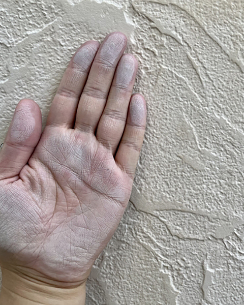 外壁を触った時に手に白い粉のようなものが付くことを指します。雨や紫外線によって塗料の合成樹脂が分解され、顔料が粉状になっている状態で、劣化の明確なサインです。